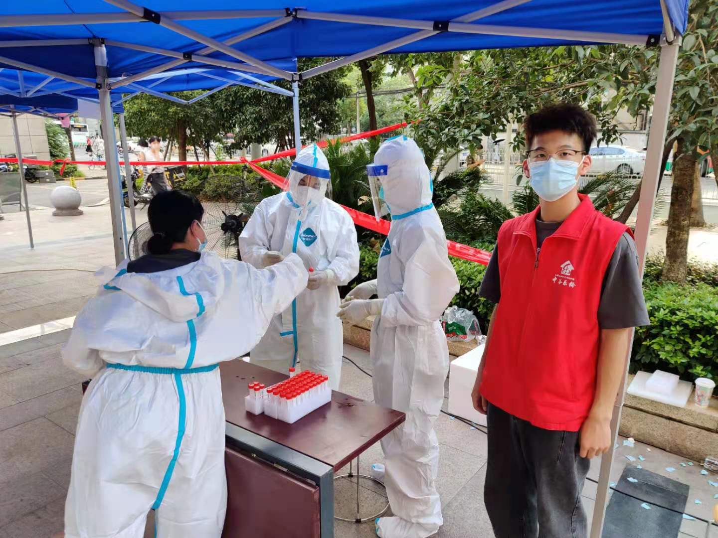 在社区核酸检测点,何宇航(右一)刚刚完成忙碌一天的工作 供图 必赢国际437官网