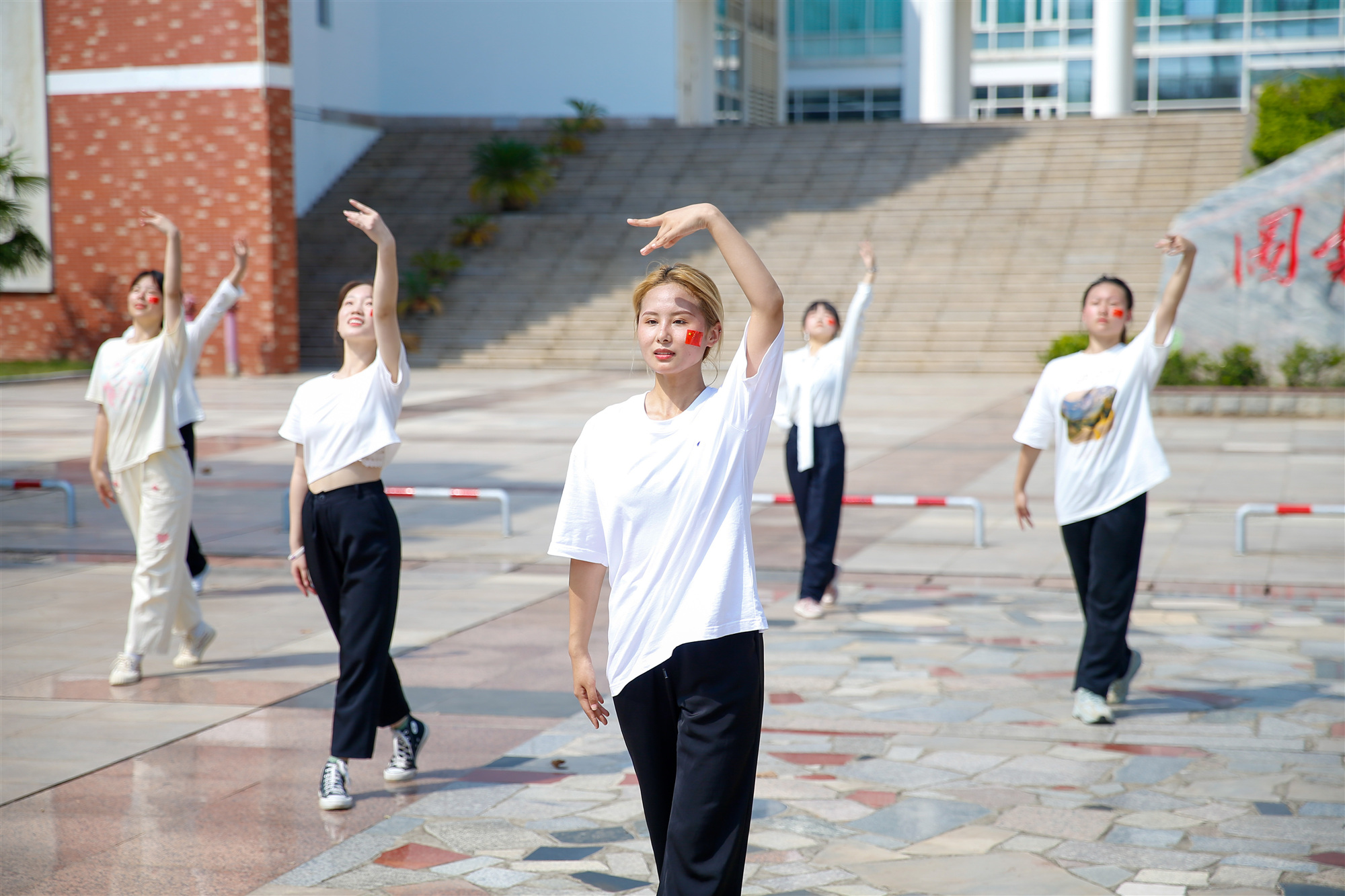 艺术学院学生以歌曲《万疆》作为主题音乐,自创舞蹈,在学校致远广场、图书馆、游泳馆等标志性建筑前起舞。每位同学均以国旗装饰贴面,将对祖国浓烈的爱融入到每一个动作中,吸引了不少学生驻足拍摄。