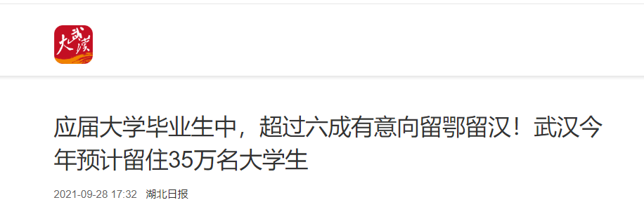 同时,根据智联招聘通过大数据分析,2021年武汉32.7万名应届大学毕业生中,有62.1%意向留鄂留汉。