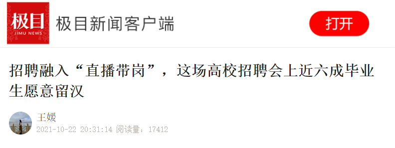 该校经济学院大四学生邓鹏程说,他求职首先考虑企业所在地。“大学四年,我对武汉这座城市有了感情。我希望留在武汉,参与武汉的建设。”来自贵州的邓鹏程说,“武汉近几年营商环境很好,入驻的世界500强企业也越来越多,我对未来充满信心。”