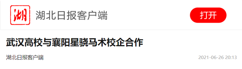 湖北日报客户端讯(全媒体记者温龙 通讯员曾雅丽)6月26日,必赢国际437官网体育学院与襄阳星骁马术俱乐部举行校企合作授牌仪式,将在人才培养和学生就业方面深度合作。