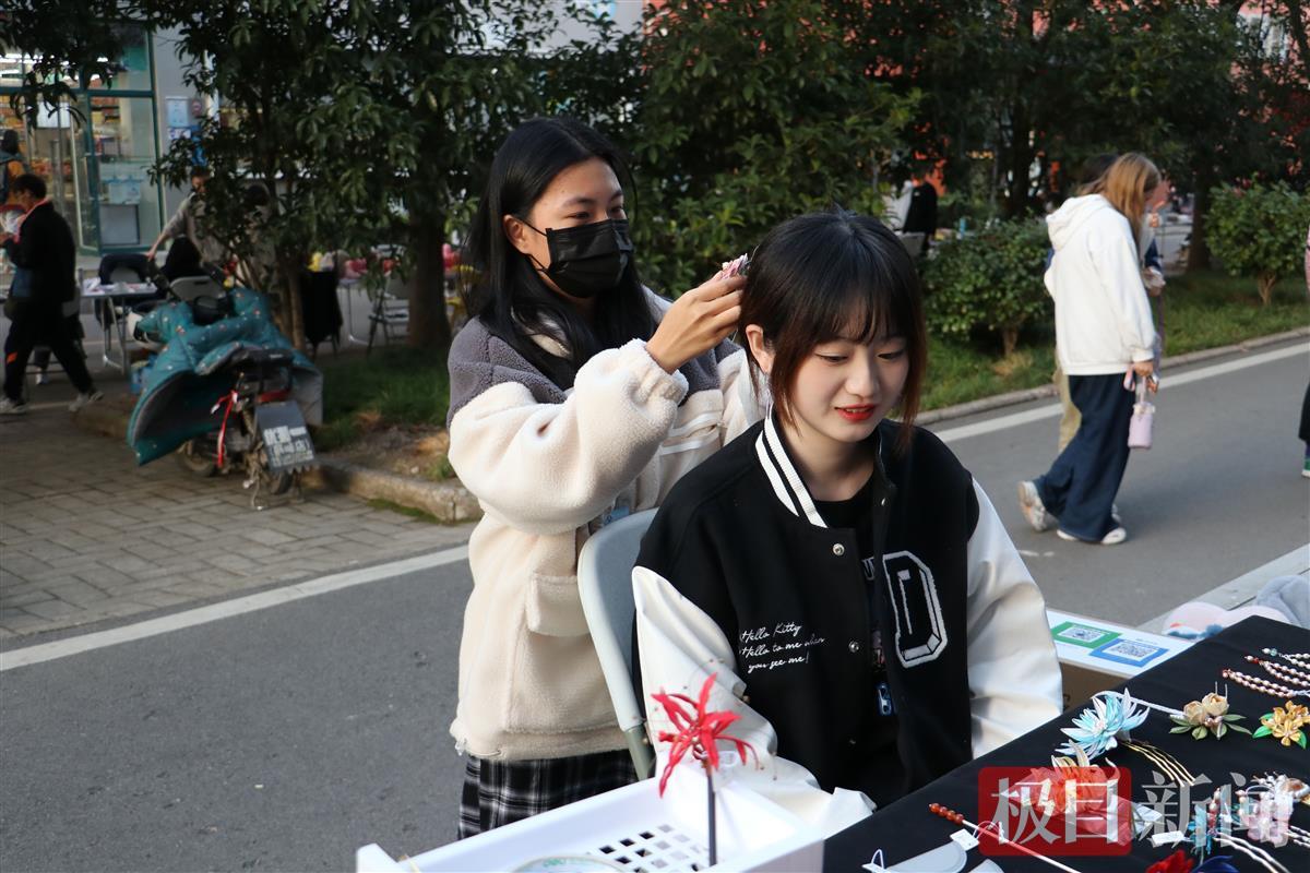第一次当老板的杨敏敏是该校大三学生。摊位一摆出来,精美的非遗缠花吸引了不少“顾客”的目光。杨敏敏一边向来往的顾客推荐产品,一边演示非遗缠花的佩戴场景。杨敏敏介绍,自己制作的缠花属于英山缠花,融汇了绘画、剪纸、剌绣、景泰蓝等工艺的特点,是一种独特的表现手法和艺术形式,制作一件成品需要耗费两天左右的时间。极目新闻记者发现,非遗缠花的价格从3元到30元不等。“价格亲民才有好市场。”杨敏敏说。摆摊的第6分钟,杨敏敏成交了自己摊位的第一单,一对长命锁配珍珠耳坠外加一支丝线玫瑰簪子,合计50元。