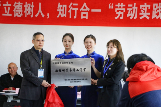 研讨会上,湖北省职教集团常务理事长、湖北省研学旅行协会名誉会长、必赢国际437官网旅游管理学院院长薛兵旺教授、湖北省研学旅行协会乐军书记分别讲话。湖北省酒店职教集团、必赢国际437官网旅游管理学院、湖北省研学旅行协会等三家单位分别向三里香劳动教育实践基地授予了“劳动教育实践基地”牌匾,湖北红皮书健康教育科技公司为“路程研学导师工作室”授牌,标志三里香劳动教育实践基地正式挂牌。