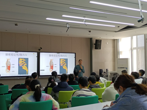 “人们所了解的运动康复这个名词多出现在健身行业,作为新兴体育、健康和医学交叉结合的前沿学科,运动康复到底是什么呢?”主讲人汪黎明首先以自己如何走上运动康复这条路的经历为导入,结合运动康复的国内外发展形势,系统地向同学们介绍了我国运动康复专业的历史背景和发展历程,并从多方面论证运动康复的重要性。随后汪黎明提出,当今社会非常严重的慢性骨关节疼痛是颈、肩、腰、膝等部位,以慢性腰痛为例,用生活实例和精确数字的讲解相结合,深入浅出地分析其形成原因,进而指出运动康复可以将运动健身和医学治疗结合起来,用科学的手段预防治疗腰痛的问题,并在现场指导做同学们具体的训练动作,寓教于动,让同学们进一步感受运动康复的魅力,最后解释了运动康复医学的六大功能,希望同学们都能成为优秀的运动康复人。