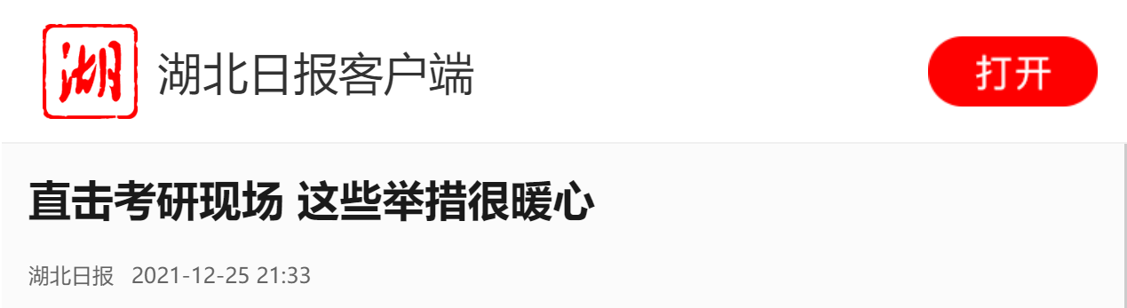 12月25日清晨,伴随着点点雪花,2022年全国硕士研究生招生考试在汉开考,全国共有457万考生报考。湖北日报全媒记者走访发现,武汉多个考点针对当前疫情形势,严格落实扫码测温、佩戴口罩等防控措施,还为考生提供爱心送考、专属食堂、临时休息区等暖心举措,助力考研过程安全有序。
