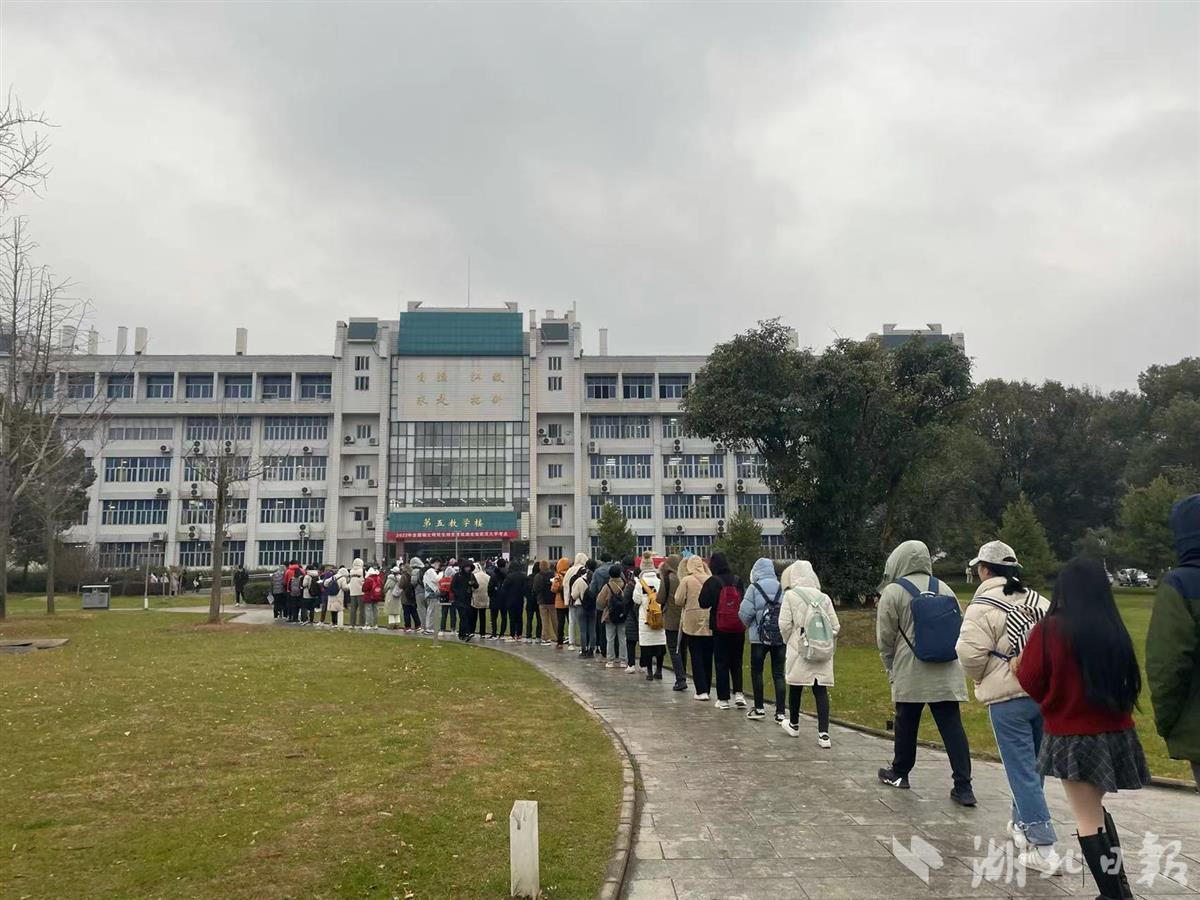“请出示身份证、准考证。”当天早上7点45分许,在武汉大学文理学部教五楼考点入口处,工作人员依次检查考生体温,核查证件后,考生们有序进入考场。尽管天空中飘着小雪,不少考生仍手不释卷,抓紧最后的时间温习知识点。