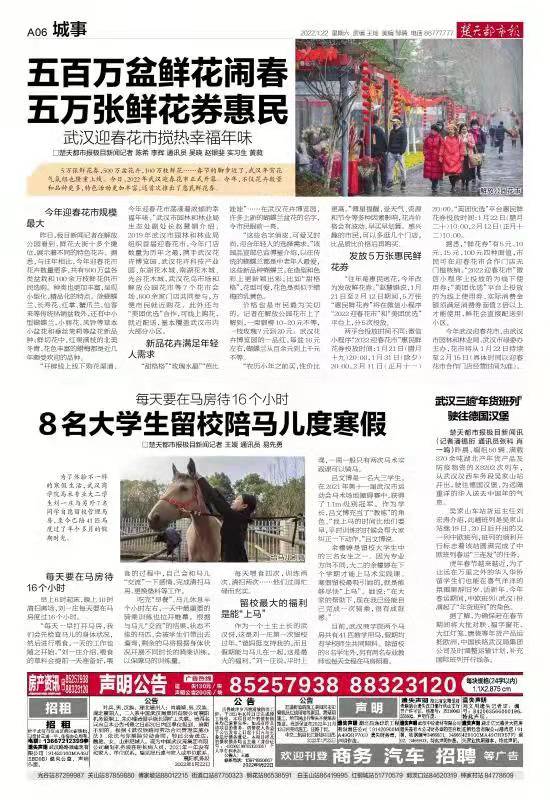 楚天都市报2022年1月22日A06城事刊登《每天要在马房待16个小时 8名大学生留校陪马儿度寒假》,报道必赢官网8名学子留校陪马儿度寒假。