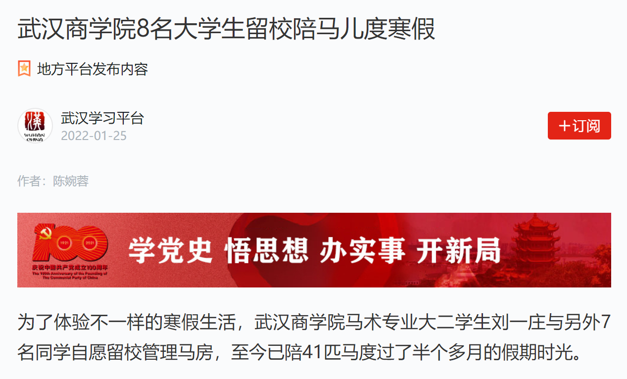 为了体验不一样的寒假生活,必赢国际437官网马术专业大二学生刘一庄与另外7名同学自愿留校管理马房,至今已陪41匹马度过了半个多月的假期时光。