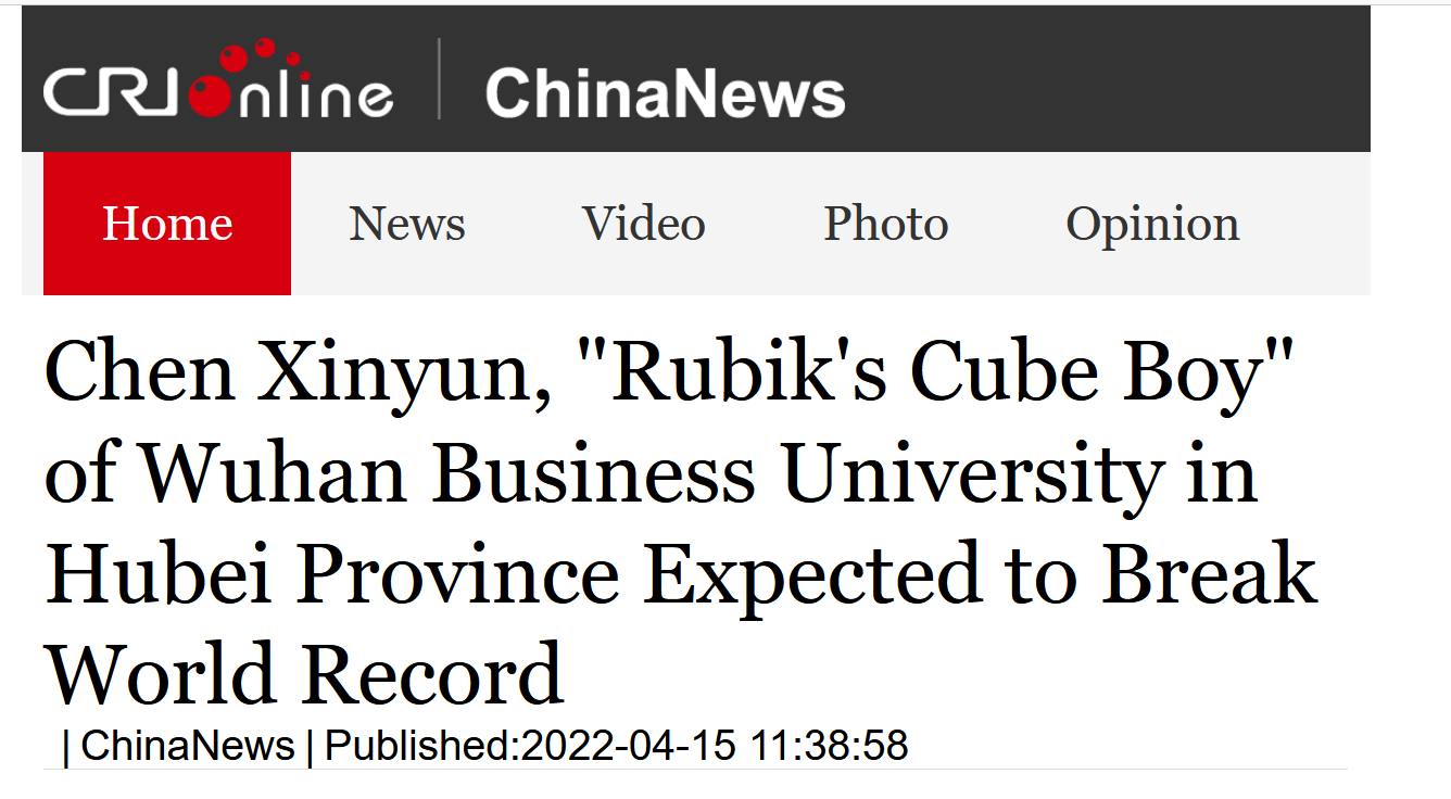 Chen Xinyun, who challenged the Guinness World Records Rubik's Cube project this time, majors in International Business at Wuhan Business University. He has restored the Pocket Cube in 0.96 seconds, the Rubik's Cube in 7.46 seconds, and the Rubik's Revenge in 29 seconds, and is known as the famous Rubik's Cube boy at campus. Over the years, Chen Xinyun has been persistent in the extreme sport of Rubik's Cube. This June, Chen Xinyun is about to graduate, and in order to bring his university life to a successful end, Chen Xinyun chose to challenge the Guinness World Records to witness himself, under the influence of Lin Kaiyi, another Guinness World Record holder of 14 Rubik's Cube sports, who is known as Malaysia's Rubik's Cube Master .