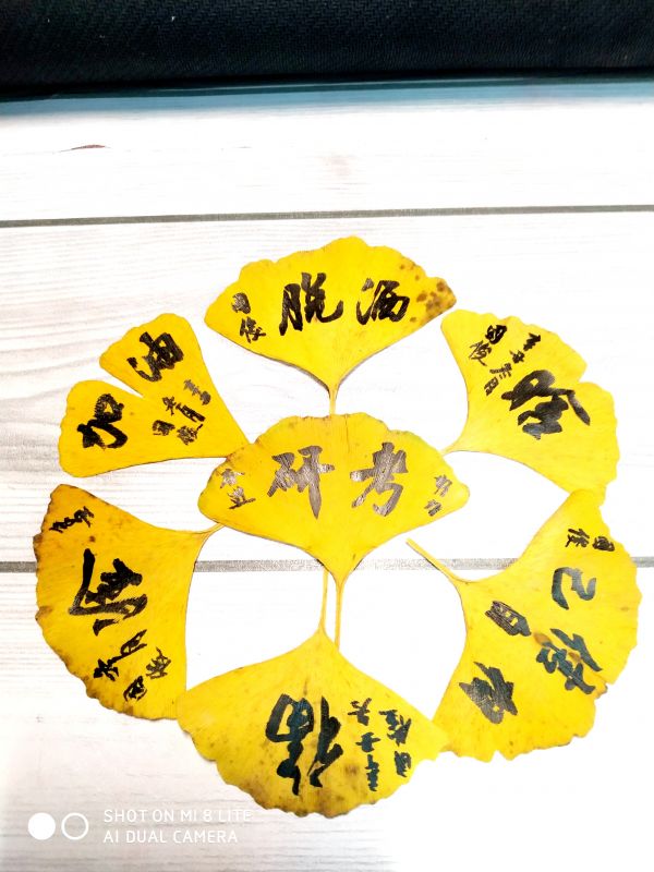杨国俊在银杏树叶上写毛笔字,给考研学生加油。杨国俊摄