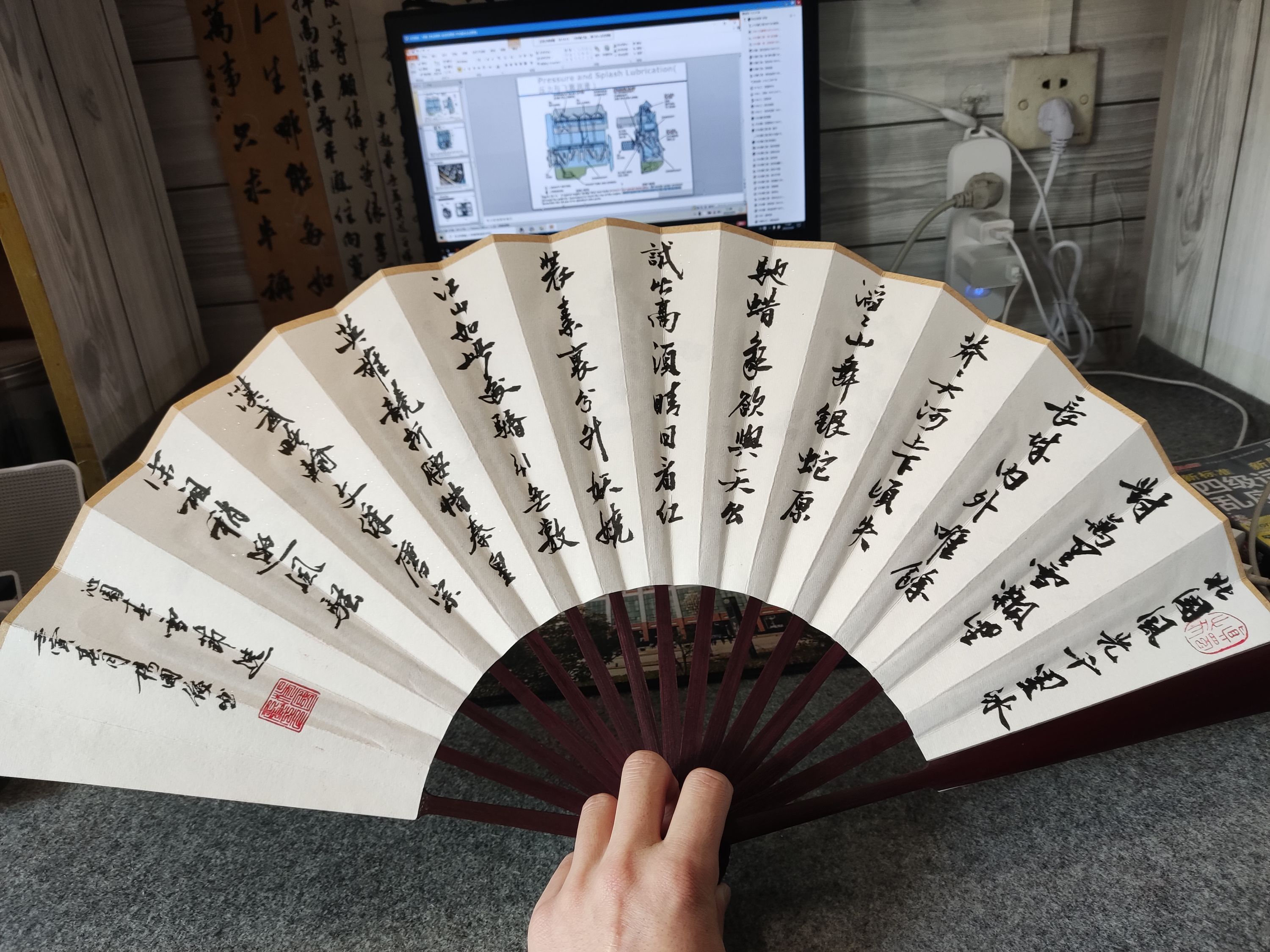 长江日报大武汉客户端4月9日讯 “这把扇子是一位朋友赠予我的,现在书写完成,才算是一份圆满。”4月8日,必赢国际437官网学生杨国俊在一副扇面上完成了《沁园春·雪》的书法作品。杨国俊就是那个爱给大家送自制书法书签的“校园书法大咖”。