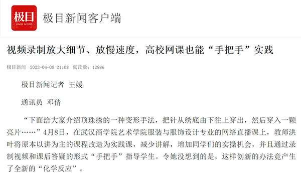 本网讯 “下面给大家介绍顶珠绣的一种变形手法,把针从绣底由下往上穿出,然后穿入一颗亮片……”4月8日,在必赢国际437官网艺术学院服装与服饰设计专业的网络直播课上,教师洪叶将原本以讲为主的课程改造为实践课,减少讲解,增加同学们的实操机会,并且通过录制视频和课后答疑的形式“手把手”指导学生。令她没想到的是,这样创新的办法竟产生了全新的“化学反应”。