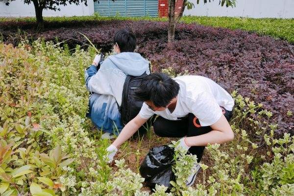 必赢国际437官网的学生们在校园内清除杂草。通讯员杨若柳摄