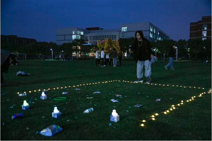 不同于陈慧伦第一天开业,2020级商务英语专业曾肖肖已经是一名“资深”店主。通过观察别人摆摊经营的模式,她独自布置了一个“套圈”摊位。明黄色小夜灯围成一圈,中间整齐摆放了薯片、夜光小熊等10余种样品,给这一隅草坪增添不少“烟火气”。在曾肖肖的摊位周围经常有学生围观,“围观学生们自觉站成一圈,往往比套圈的同学更紧张激动。”曾肖肖介绍,小摊周围一阵阵套中的欢呼声也给她带来不少人气。21级现代物业管理专业张明哲每次来到套圈摊位总能收获满满。“我自己算是半个‘套圈高手’,没想到在学校也能找到感兴趣的娱乐活动,解压又有趣!”张明哲说。