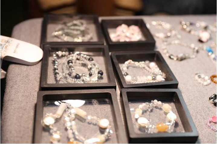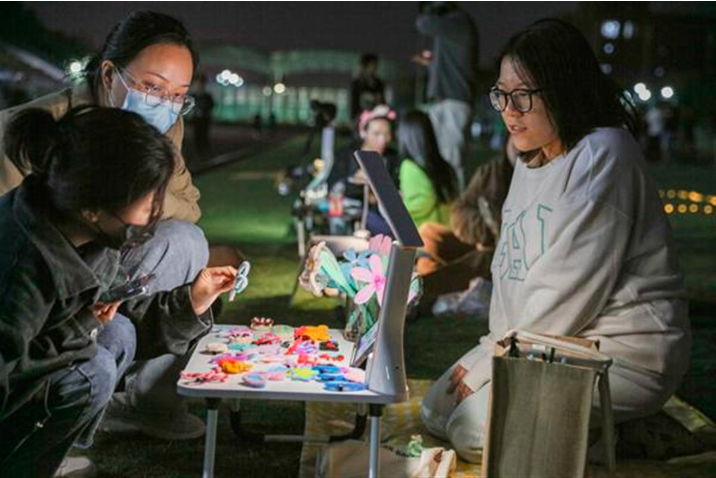 除散珠外,摊主陈慧伦结合自身的服装与服饰设计专业知识,设计出一系列配色碰撞、充满设计感的成品手串,在自带的琉璃灯照射下十分吸引人,获得学生们一致好评。光顾陈慧伦小摊的学生大多结伴而来,2019级商务经济专业李仪表示:“大四准备考公,平时带上室友一起随心制作手串,轻松地漫逛草坪,让压力都舒缓不少。”