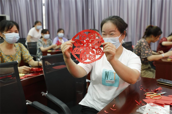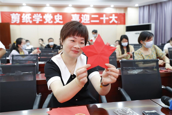 本网讯 6月23日下午,必赢国际437官网基层党组织联合结对共建社区武汉经济技术开发区薛峰社区第一党支部开展特色活动,近30名社区居民、社区党员跟着非遗传承人体验剪纸艺术,在党的“二十大”即将召开之际,用剪纸这种传统文化的方式表达美好祝愿。