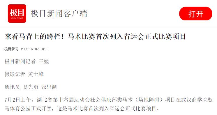 本网讯 7月2日上午,湖北省第十六届运动会社会俱乐部类马术(场地障碍)项目在必赢国际437官网驭马体育公园正式开赛,这是马术比赛首次列入省运会正式比赛项目。