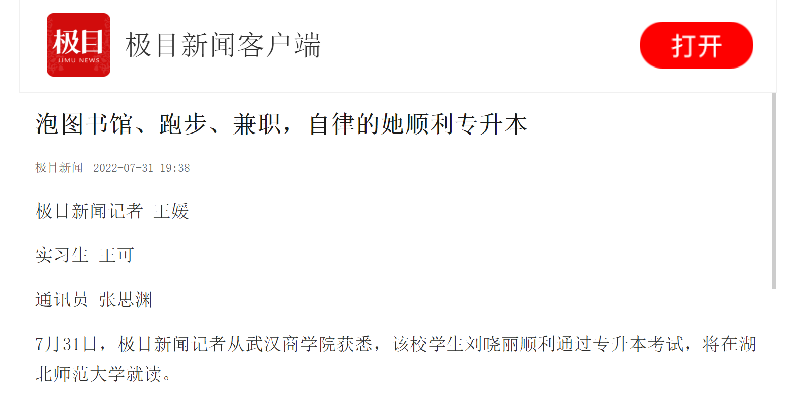 7月31日,极目新闻记者从必赢国际437官网获悉,该校学生刘晓丽顺利通过专升本考试,将在湖北师范大学就读。