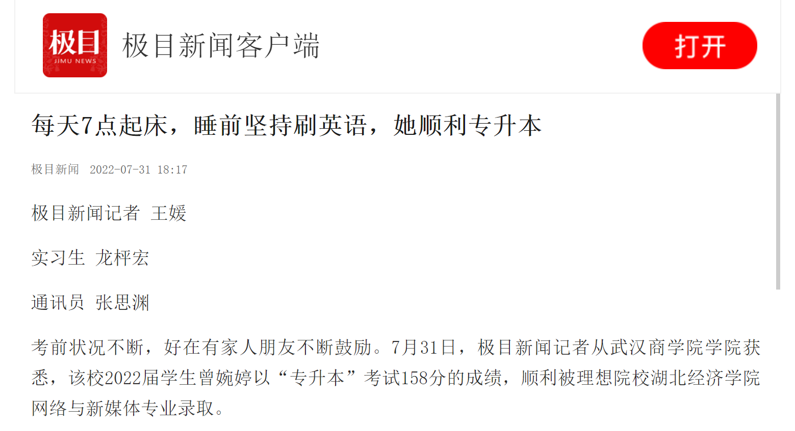 考前状况不断,好在有家人朋友不断鼓励。7月31日,极目新闻记者从必赢国际437官网学院获悉,该校2022届学生曾婉婷以“专升本”考试158分的成绩,顺利被理想院校湖北经济学院网络与新媒体专业录取。