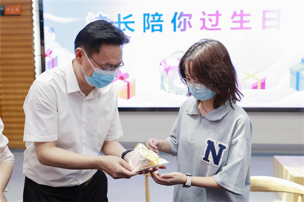 另一位到场“寿星”黄贤哲是该校经济学院新生。面对校长彭瑜亲切的祝福,黄贤哲回应道:“贤能哲学,这是父母对我的期望,今年正好是我的18岁生日,我会一直带着这份动力,成为一名合格的武商院学子。”