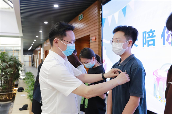 校长彭瑜为新生佩戴校徽 摄影 王珊珊
