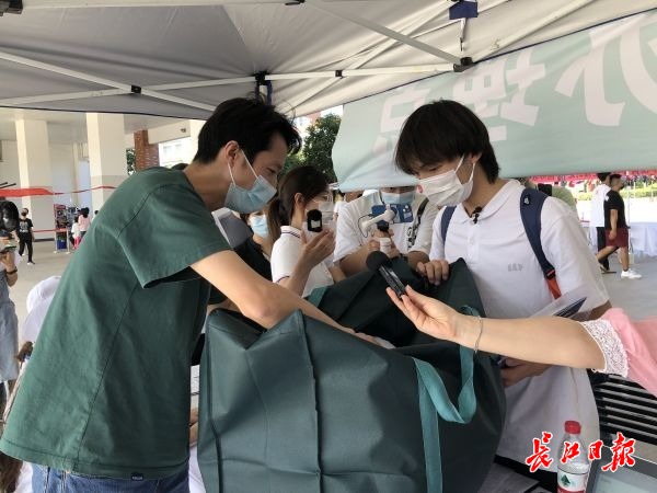 必赢国际437官网新生绿色通道在为周筱(右一)办理相关手续,老师送上学校赠送的大礼包。 记者胡义华 摄