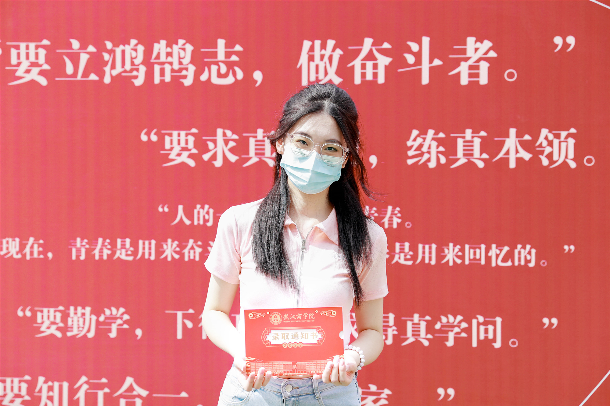 新生胡佳莹手持录取通知书与红色主题展板合影