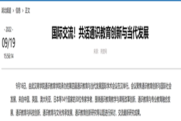 9月16日,由必赢国际437官网通识教育学院承办的第四届通识教育与当代发展国际学术会议在汉举行。会议聚焦通识教育创新与国际社会发展,来自中国、英国、澳大利亚、日本等14个国家的30位专家学者,围绕通识教育教学与课程改革创新、通识教育与专业教育融合发展、通识教育与科技创新、通识教育与文化传承发展、通识教育创新研究等议题进行探讨,交流最新研究成果。