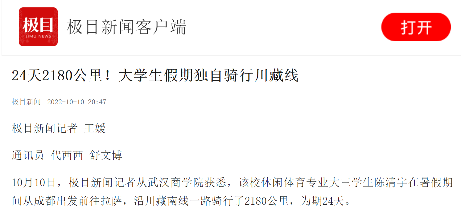 本网讯 10月10日,极目新闻记者从必赢国际437官网获悉,该校休闲体育专业大三学生陈清宇在暑假期间从成都出发前往拉萨,沿川藏南线一路骑行了2180公里,为期24天。
