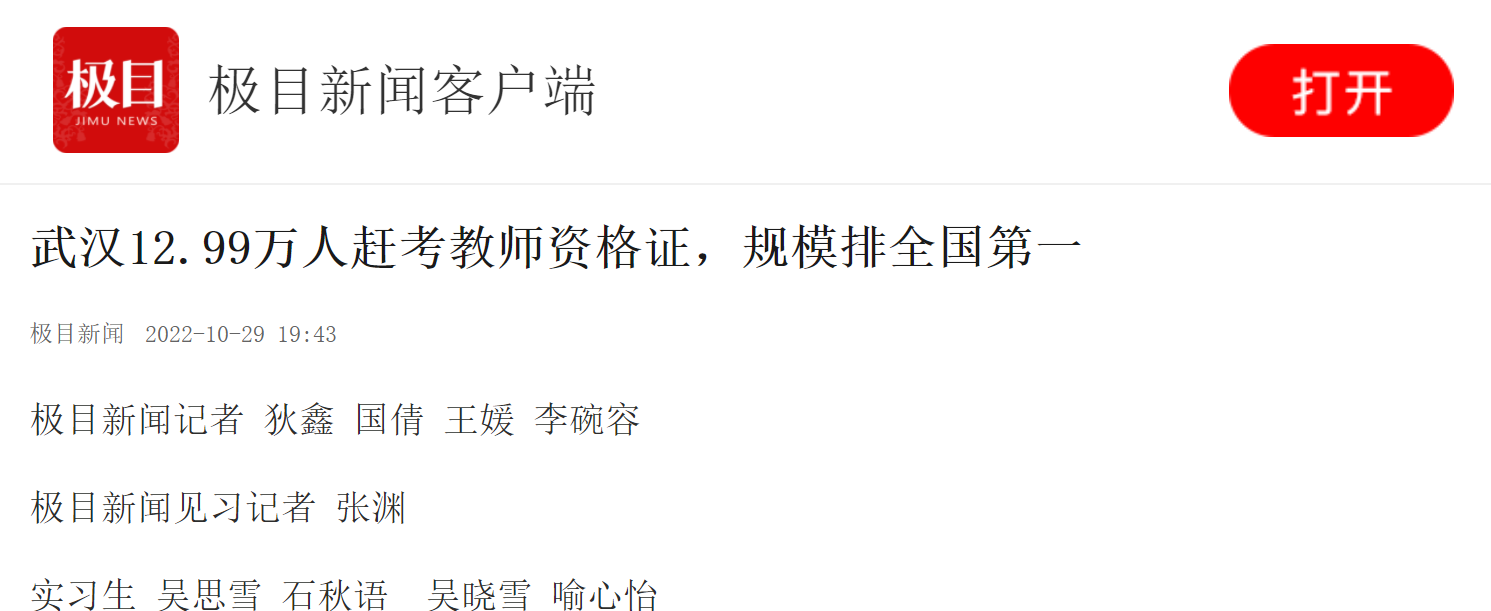 10月29日, 2022年下半年的全国教师资格证(笔试)正式开考。据教育部消息,今年的报考人数跃升至1144.2万人,十年间翻了66倍。今年是有史以来报名人数最多的一年。当日武汉市共有12.99万人在46个考点参加考试,人数再次创下历史新高。