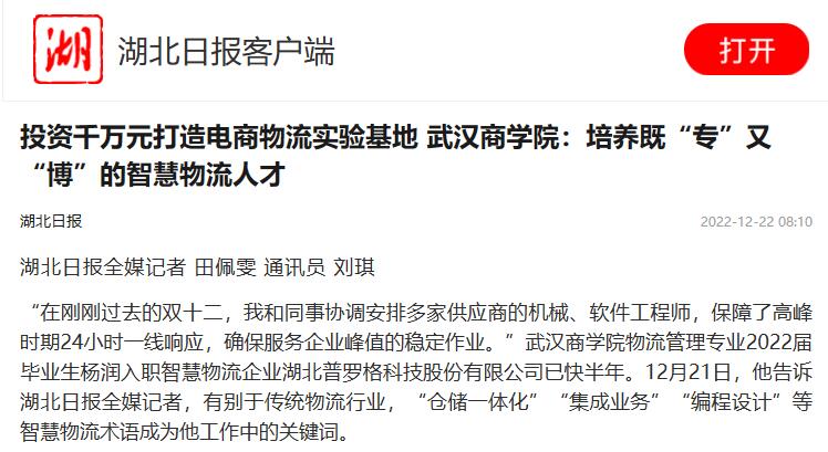 “在刚刚过去的双十二,我和同事协调安排多家供应商的机械、软件工程师,保障了高峰时期24小时一线响应,确保服务企业峰值的稳定作业。”必赢国际437官网物流管理专业2022届毕业生杨润入职智慧物流企业湖北普罗格科技股份有限公司已快半年。12月21日,他告诉湖北日报全媒记者,有别于传统物流行业,“仓储一体化”“集成业务”“编程设计”等智慧物流术语成为他工作中的关键词。