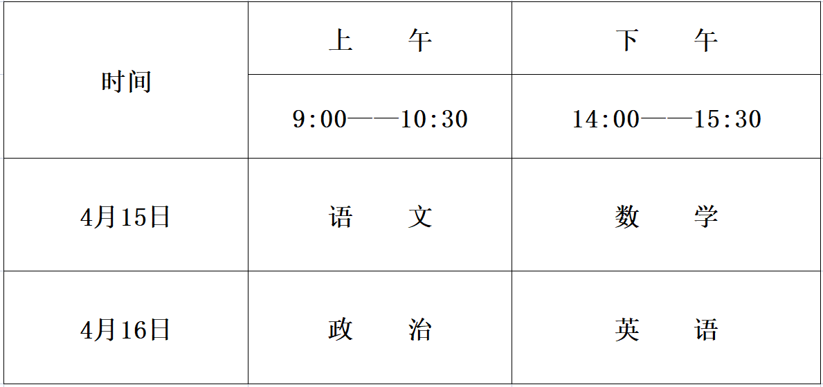 1、文化考试科目为语文、数学、政治、英语四科,每科满分为150分,四科满分为600分,考试时间如下: