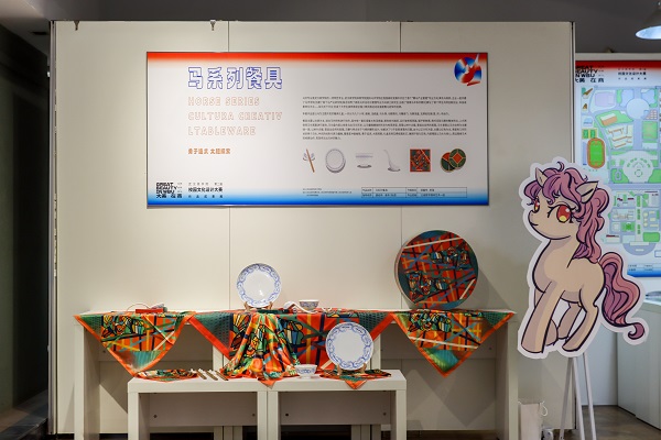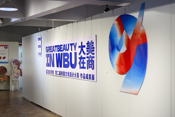 在艺术展示厅现场,优秀作品琳琅满目。其中,充满着高贵神秘气息的“马系列餐具”是以马鞍、缰绳等为创意来源,将力量以柔美而有张力的纹饰绘制在硬朗质感的瓷器上,再经过手工烧制,将校园特色与传统瓷器相结合;“武商院学士服”作品则是学士服与传统汉绣的融汇;它们都对装饰纹样和器物造型进行了大胆探索,展现出现代大学生对传统文化的致敬精神;也有作品体现了跨专业的交融,如“食品类伴手礼产品”作品是由食品科技学院与艺术学院的学生合作完成。来自不同专业的学生在同一个项目中相互融合碰撞,学习成长。