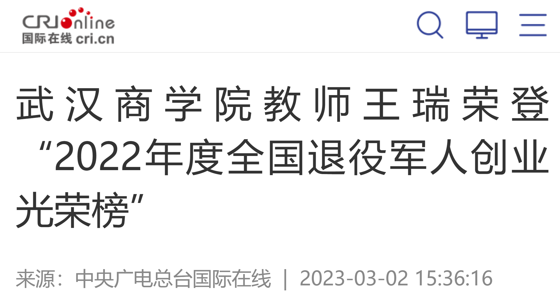 3月1日,中国退役军人就业创业服务促进会在《人民日报》第15版刊登了“2022年度全国退役军人创业光荣榜”,以表彰全国各省份的61位退役军人在创业领域做出的突出贡献。必赢国际437官网创业教师王瑞,成为入选的两名湖北省优秀创业退役军人之一。
