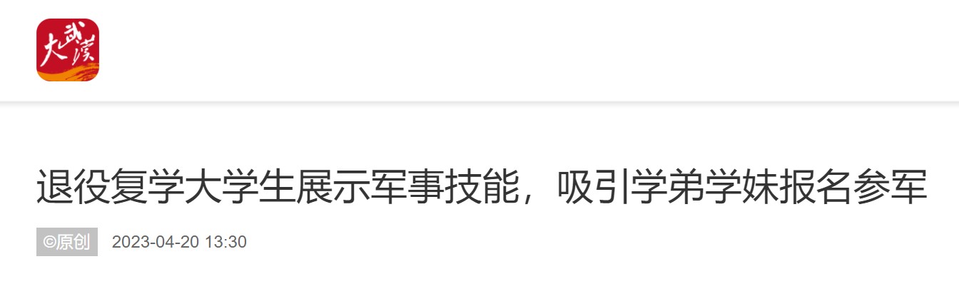 从武警某部退役后复学的大学生董大创告诉学弟学妹们:“在部队,我成长很快,练就了强健的体魄,结识了来自五湖四海的战友,拥有了一段宝贵的人生经历……更重要的是,我在自己最美好的年纪进入军营服役,为强军兴军事业奉献了自己微薄的力量。我认为,有志青年就应该去部队这个大舞台上锤打锻造自己。”