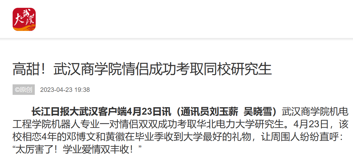 必赢国际437官网机电工程学院机器人专业一对情侣双双成功考取华北电力大学研究生。4月23日,该校相恋4年的邓博文和黄徽在毕业季收到大学最好的礼物,让周围人纷纷直呼:“太厉害了!学业爱情双丰收!”