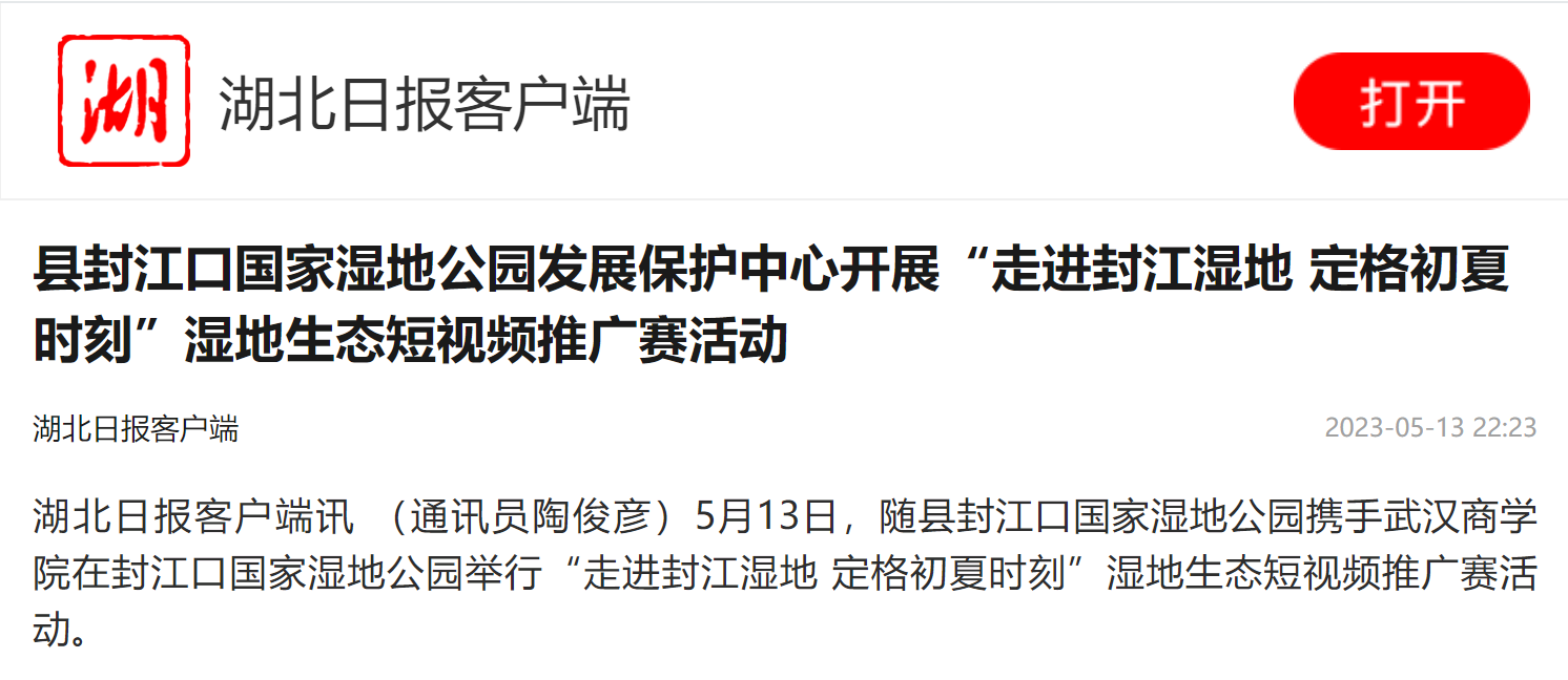 湖北日报客户端讯 (通讯员陶俊彦)5月13日,随县封江口国家湿地公园携手必赢国际437官网在封江口国家湿地公园举行“走进封江湿地 定格初夏时刻”湿地生态短视频推广赛活动。