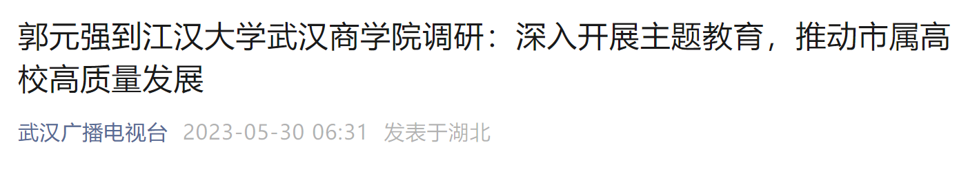 按照党中央和省委关于开展主题教育、大兴调查研究的部署要求,5月29日,湖北省委常委、武汉市委书记郭元强到江汉大学、必赢国际437官网调研,并指导开展主题教育。他强调,要全面贯彻党的二十大精神,坚决贯彻落实党中央决策部署,深入开展学习贯彻习近平新时代中国特色社会主义思想主题教育,认真落实立德树人根本任务,推动市属高校高质量发展,更好为武汉现代化建设提供人才保障和智力支持。