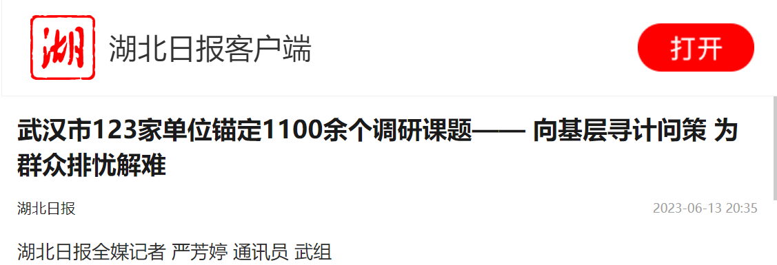 目前,武汉采取“基层点题、群众出题、主动破题”等方式,聚焦贯彻落实习近平总书记考察湖北武汉重要讲话和指示批示精神,聚焦人民群众反映强烈的突出问题,聚焦基层反映亟需解决的问题,谋选题、定选题,引导“四大家”班子、全市123家单位班子成员确定调研课题1100余个。