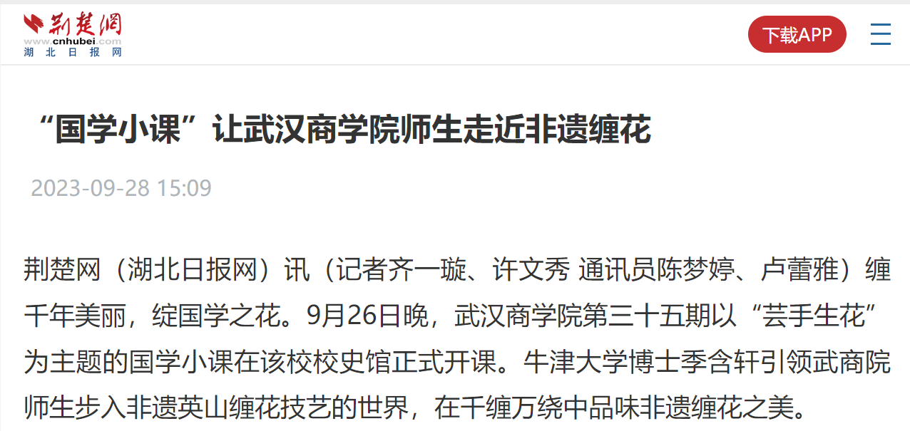 荆楚网(湖北日报网)讯(记者齐一璇、许文秀 通讯员陈梦婷、卢蕾雅)缠千年美丽,绽国学之花。9月26日晚,必赢国际437官网第三十五期以“芸手生花”为主题的国学小课在该校校史馆正式开课。牛津大学博士季含轩引领武商院师生步入非遗英山缠花技艺的世界,在千缠万绕中品味非遗缠花之美。