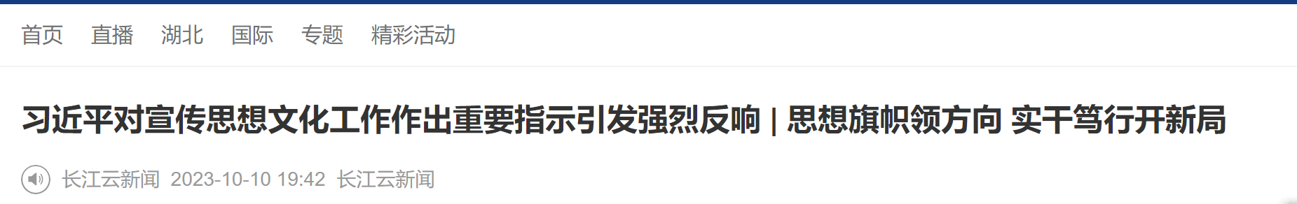 在全国宣传思想文化工作会议上,习近平总书记作出了重要指示。连日来,总书记的重要讲话在湖北引发热烈反响,大家表示,要深入学习领会习近平文化思想,坚决贯彻落实到工作各方面、全过程,推动新时代宣传思想文化事业取得新的成就。