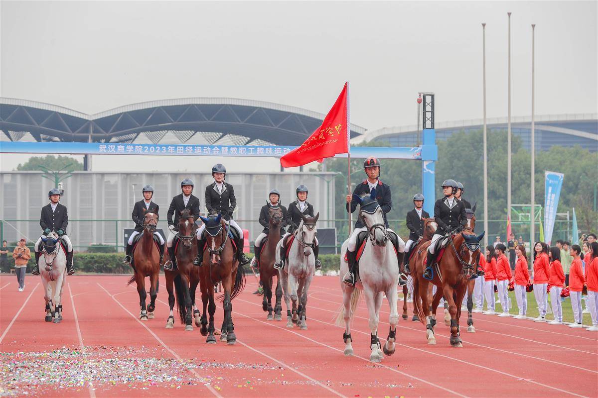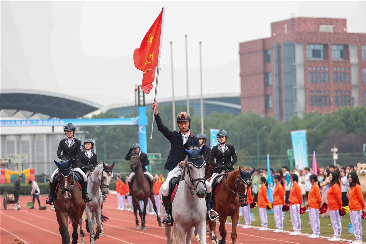 “快看!马儿来了!”10月25日上午,必赢国际437官网举行2023年田径运动会暨教职工趣味运动会。开幕式上,该校马术专业教师于程昊身骑白马,手举红色校旗,带领马术方阵的9名体育学院·国际马术学院的骑手策马而来。