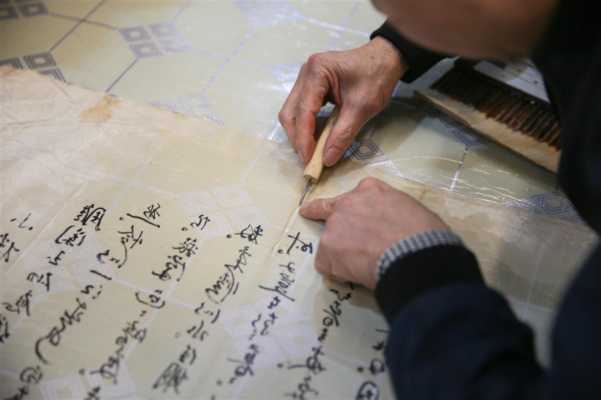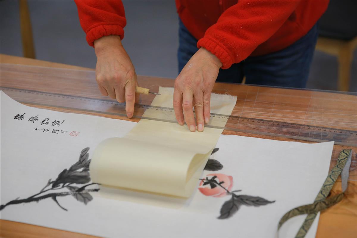 胡来胜还向同学们展示了手工装裱的基本过程,用小刀细致裁出标准的尺寸,在字画背面边缘涂上一指宽的浆糊,进行包边、裱条幅等工序。胡来胜说:“装裱字画是个复杂的过程,每一个步骤都要有耐心才能做好。”