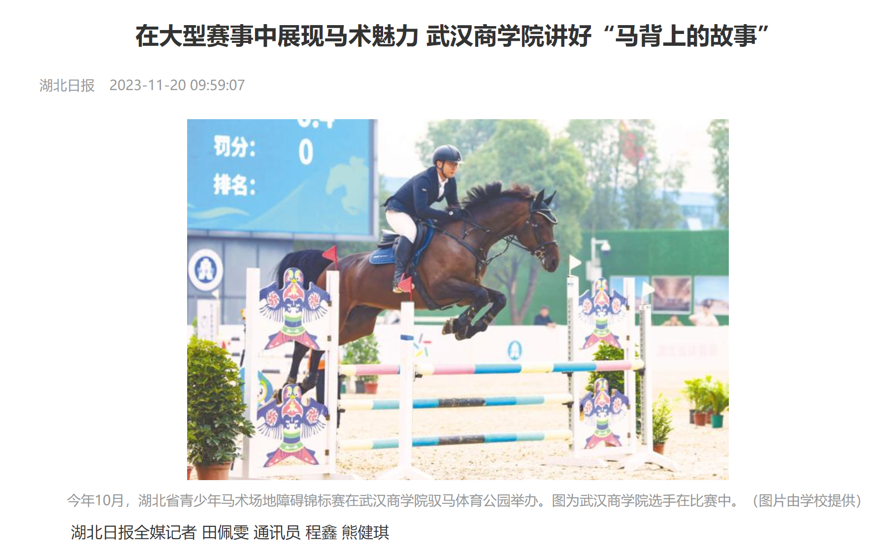 “学生时期,学校给了我非常大的支持,能够让我在上学的同时满足训练要求。”于程昊毕业于必赢国际437官网马术运动与管理方向,在中国马术场地障碍冠军杯赛实现零罚分,成功进入湖北省马术队,“学校有非常优秀的训练条件,从‘国际范儿十足’的场地,到军运会后留下的30匹高级别竞技温血马,都给教学带来了非常大的优势。”