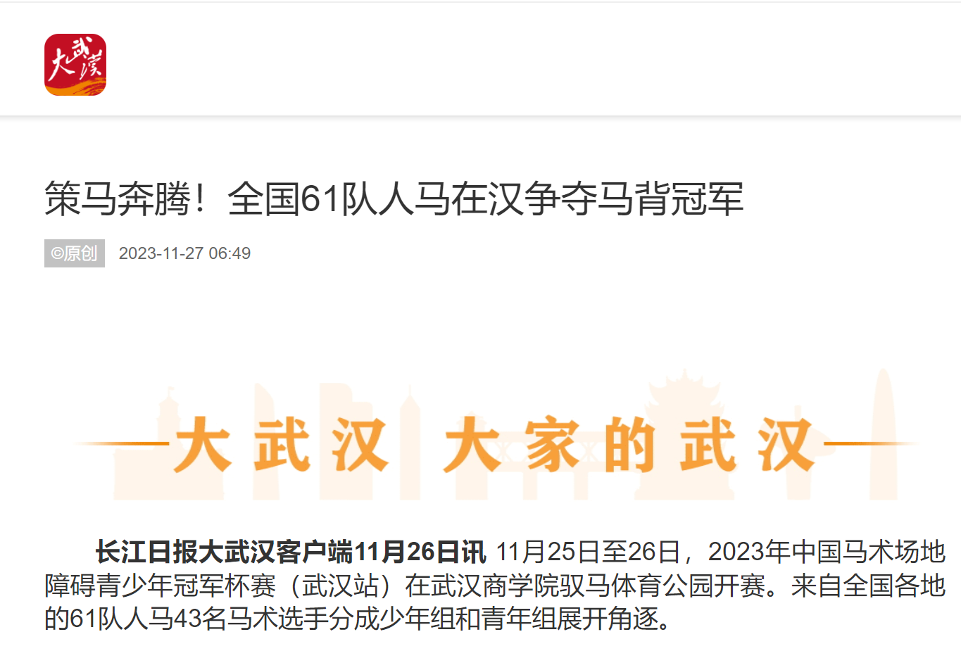 长江日报大武汉客户端11月26日讯 11月25日至26日,2023年中国马术场地障碍青少年冠军杯赛(武汉站)在必赢国际437官网驭马体育公园开赛。来自全国各地的61队人马43名马术选手分成少年组和青年组展开角逐。