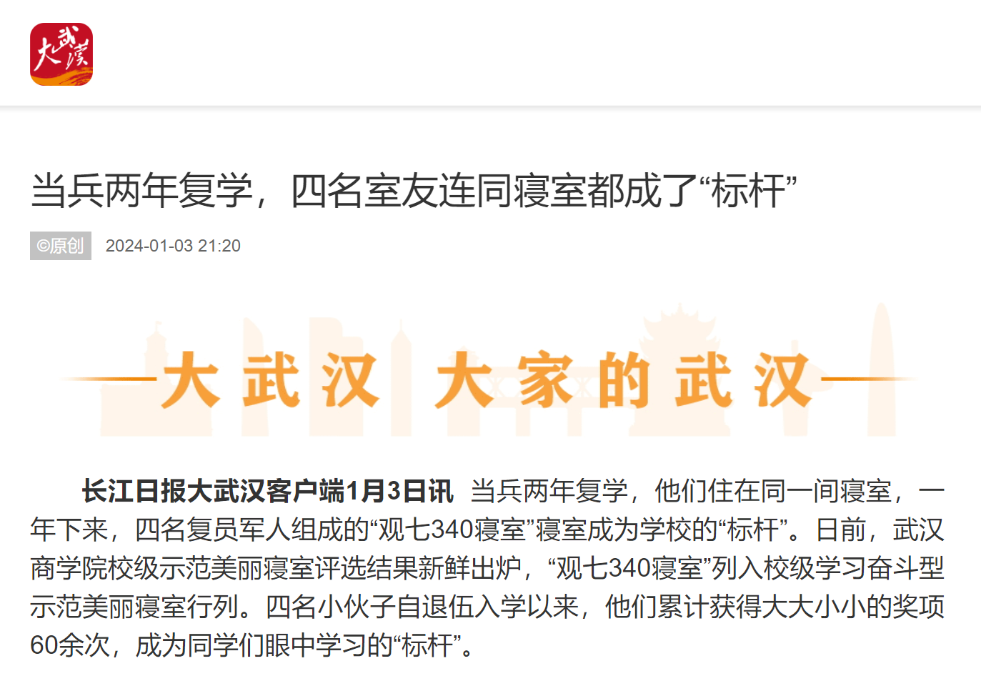 长江日报大武汉客户端1月3日讯 当兵两年复学,他们住在同一间寝室,一年下来,四名复员军人组成的“观七340寝室”寝室成为学校的“标杆”。日前,必赢国际437官网校级示范美丽寝室评选结果新鲜出炉,“观七340寝室”列入校级学习奋斗型示范美丽寝室行列。四名小伙子自退伍入学以来,他们累计获得大大小小的奖项60余次,成为同学们眼中学习的“标杆”。