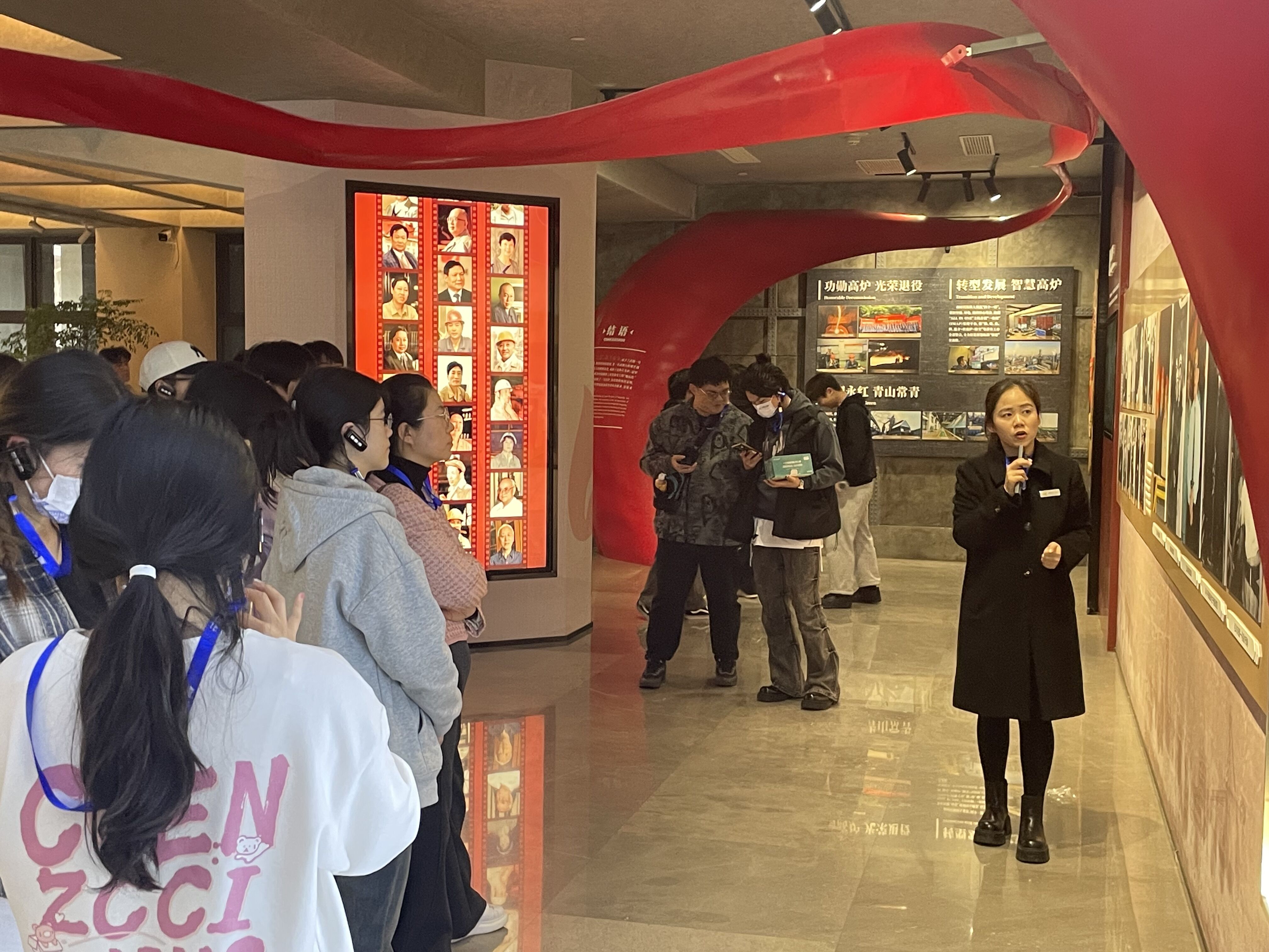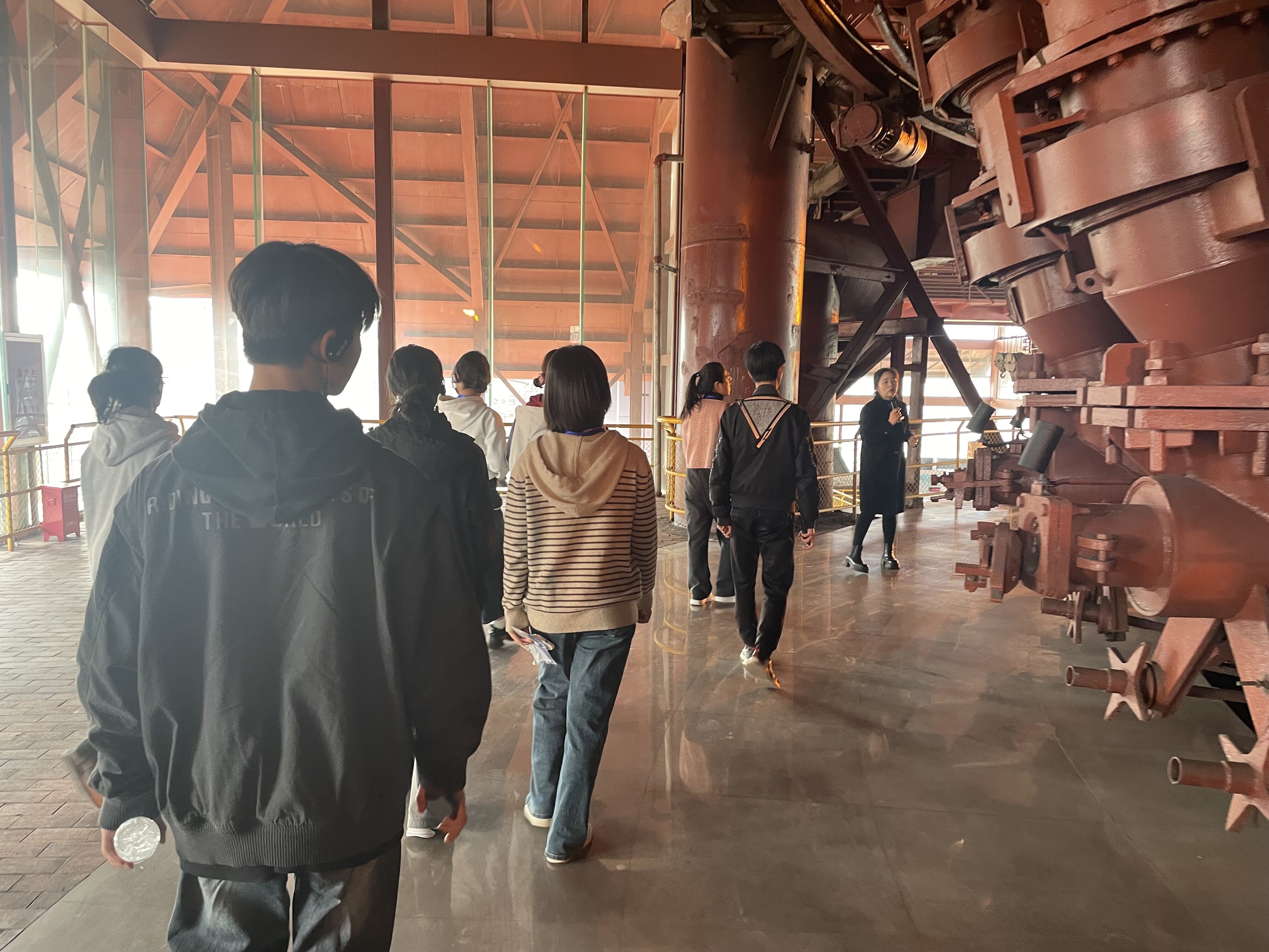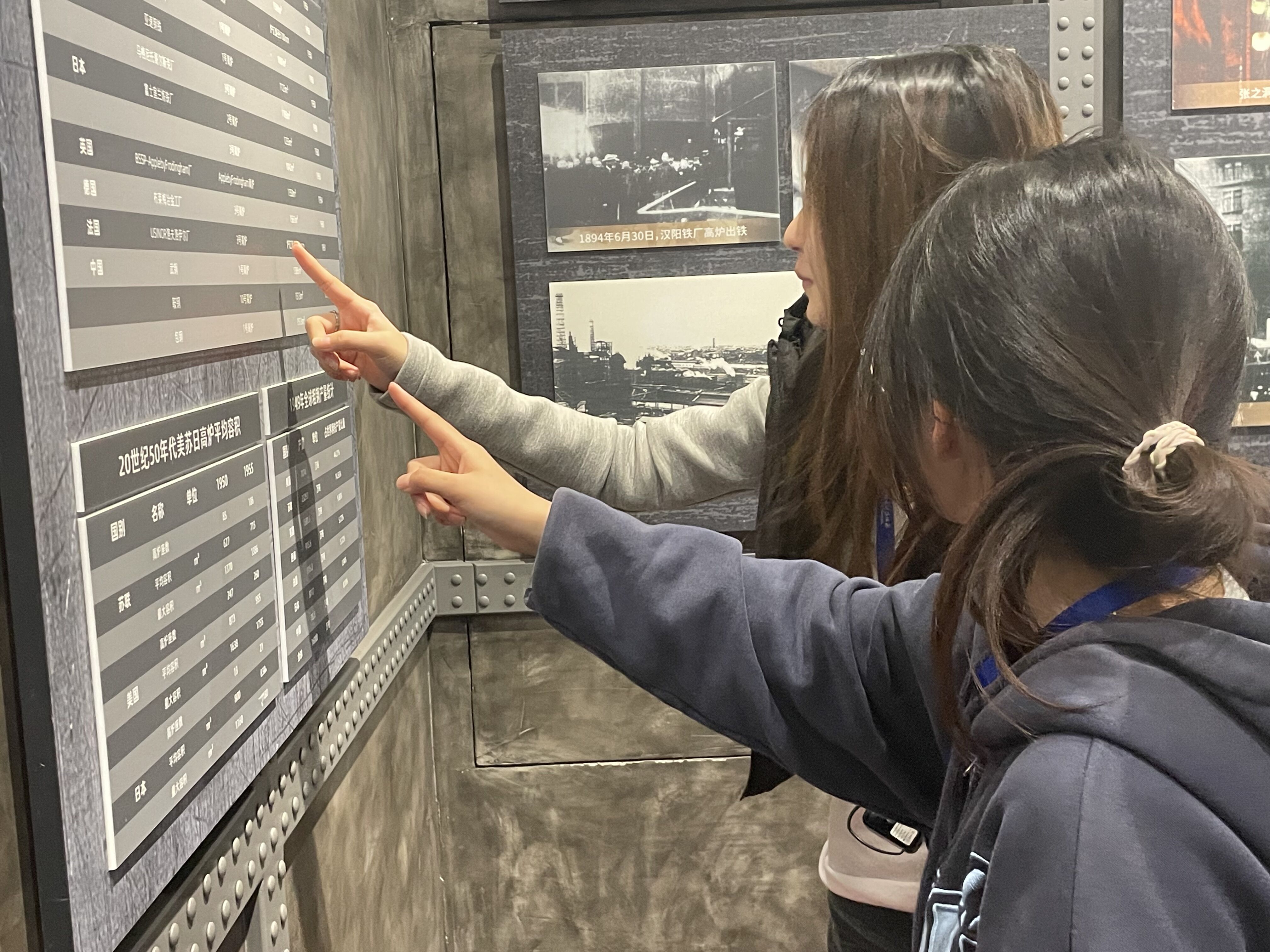 跟随讲解员的步伐,大家来到了武钢一号高炉的核心位置。这是一座巨型车间,整体结构坚固,屋檐下的钢索、支柱相当抢眼,天花板下的钢柱结构也十分震撼。“武钢炼铁也炼人!”2022级食品质量与安全二班刘沂看到这句振奋人心的话时不禁发出了这样的感慨:“在这里,每一块砖、每一片铁都仿佛在诉说着过去的故事,那些曾经在这片土地上挥洒汗水、奉献青春的人们的身影仿佛还在眼前。”
