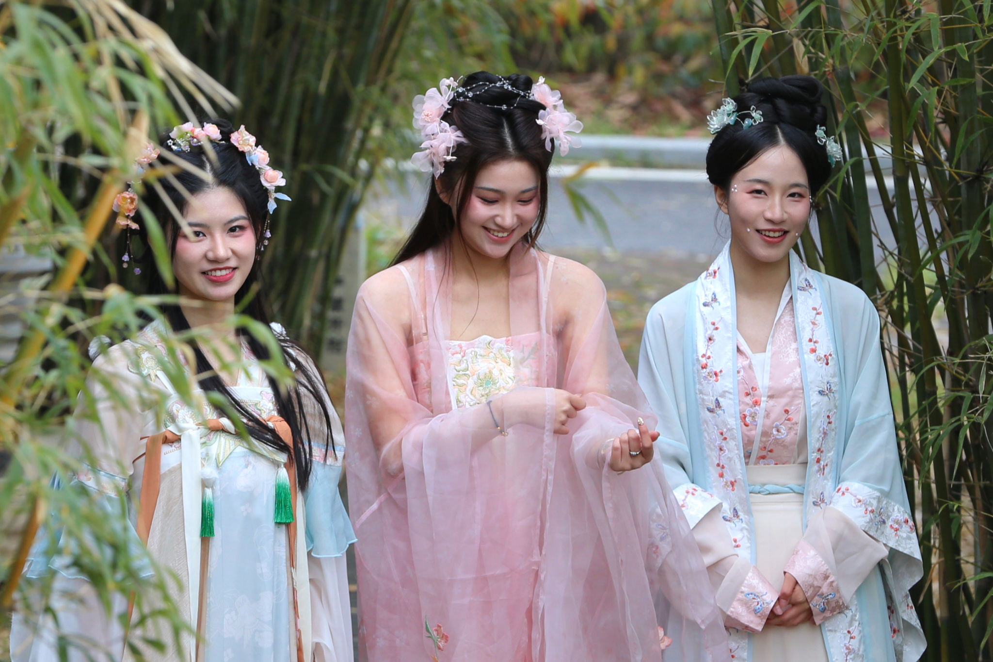 着襦裙、佩披帛、巧上妆、贴花黄……从小就喜欢穿汉服的经济学院大二学生翟雨涵抢到汉服体验名额后,早早地就来到了现场梳妆打扮。妆造结束后,翟雨涵边拍照边说:“汉服不仅体现着中国人对服饰的审美,还蕴藏着华夏传承千年的文化魅力。你看,汉服上常常缝制牡丹、梅花、龙凤、喜鹊等图案,展现出生动自然、精美雅致的东方服饰风格,也是人们对美好生活的向往和希冀。”翠袖红裙、宽袍广袖、青衫白褂。越罗衫袂迎春风,玉刻麒麟腰带红。同学们身着各式汉服或撑一把油纸伞,或举着团扇,在校园大道、图书馆、鹤鸣湖畔等处翩然走过,成为校园一道独特的风景,吸引了大批师生驻足观看。这次汉服体验让2022级物流管理专业的程佳瑶不住地感慨:“第一次穿汉服,体验真的非常好!我穿的宋制汉服,上面独特的刺绣十分精美,巧妙地反映出了宋代的礼仪文化特点。我感觉自己就像穿越到了宋朝,来了一场文化之旅,也来了一场春天的旅行。”