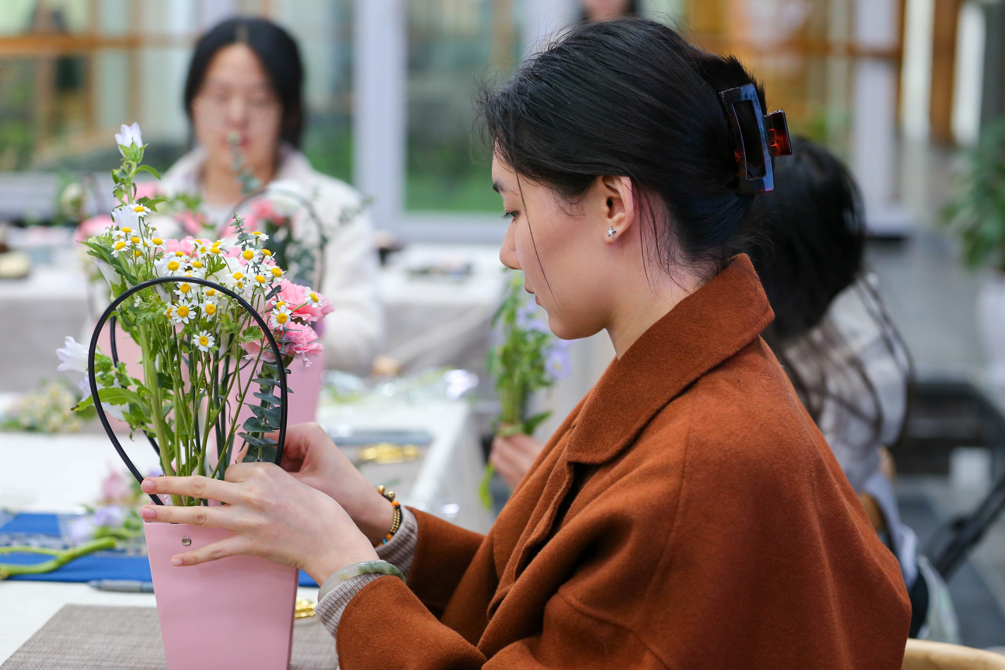 春风有信,花开有期。在花艺沙龙插花艺术体验中,学生们在花草的世界里精心构思、大胆创意,一朵朵清雅的康乃馨、娇嫩的铃兰花、鲜艳的花毛茛、绽放在花篮里,再以小雏菊、洋桔梗、绿叶精心点缀。随后,一簇簇美丽别致、层次丰富的插花作品“新鲜出炉”。主花要大气要压得住,辅花要注意大小和色彩的搭配,不能盖过主花的风头,所有花材在构图时要保证色彩协调,但是也要在统一中求变化。2022级食品科技学院的吴晓雪分享说,“之前看别人插花随意又轻松,以为插花很简单,等真正上手才发现要考虑的要素,需要的技巧非常多。这场春分集会,让我收获满满!”