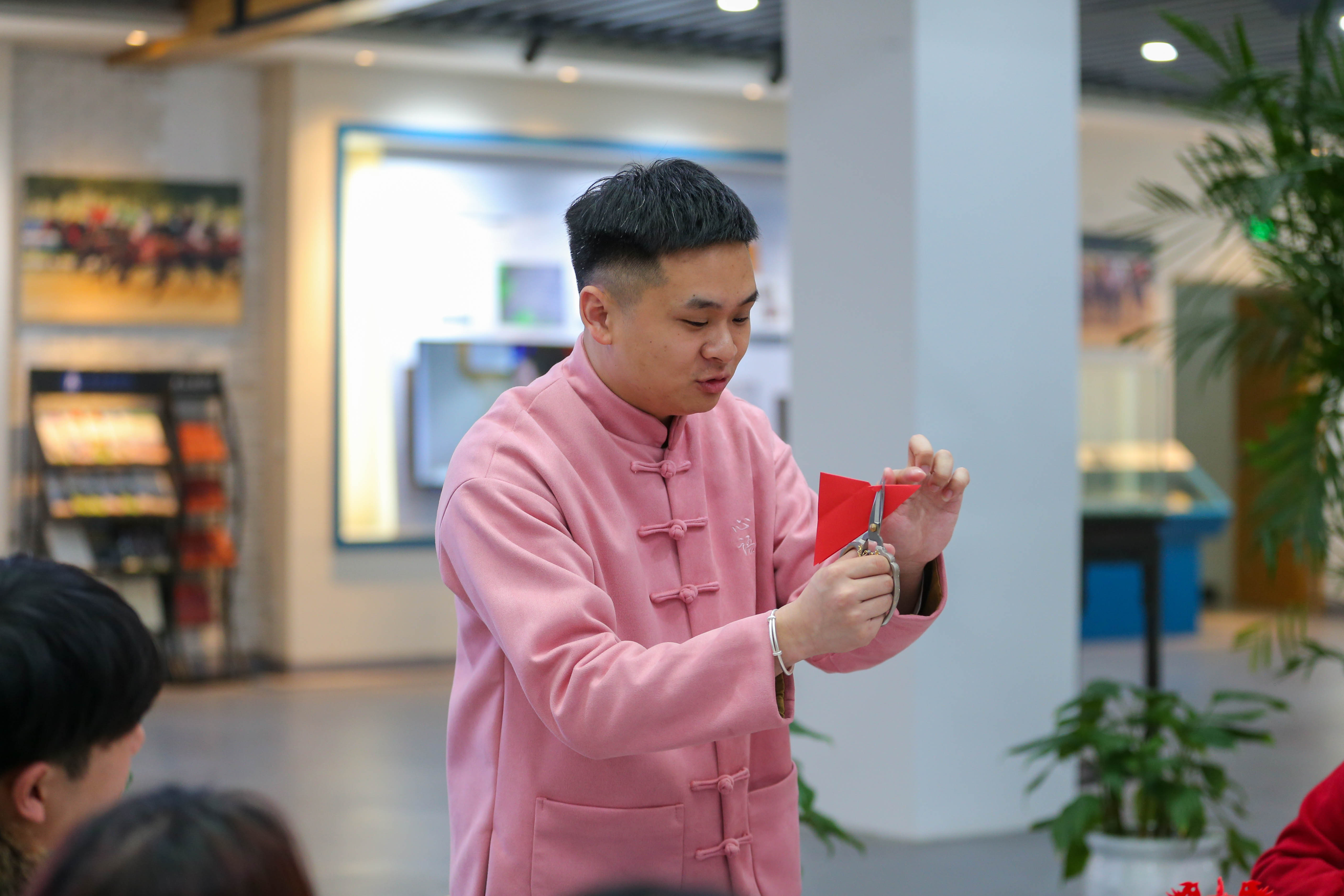 与此同时,春分立蛋、非遗剪纸活动也进行得如火如荼。红纸、巧手,几下翻飞之后,两两略微拼折,一个“中国结”与一个“春”字便成型,折剪中国结时,堵河剪纸传承人周坤边折边讲:“大家看这条线上要保持基本垂直的状态,代表着播种希望。顺着这个线往下再往前又剪一段,再绕个圆弧,看!就像太阳的形状嘛!这也就寓意着生活美满。”活动现场,学生们积极配合,不亦乐乎。2023级艺术学院服装与服饰设计三班张恬表示,一把剪刀一双巧手,就能让一张普通的红纸变换这么多美妙的样式,剪纸艺术,真的“妙”到极致!